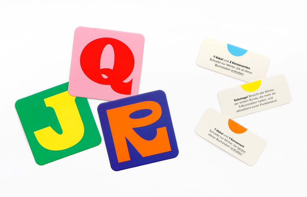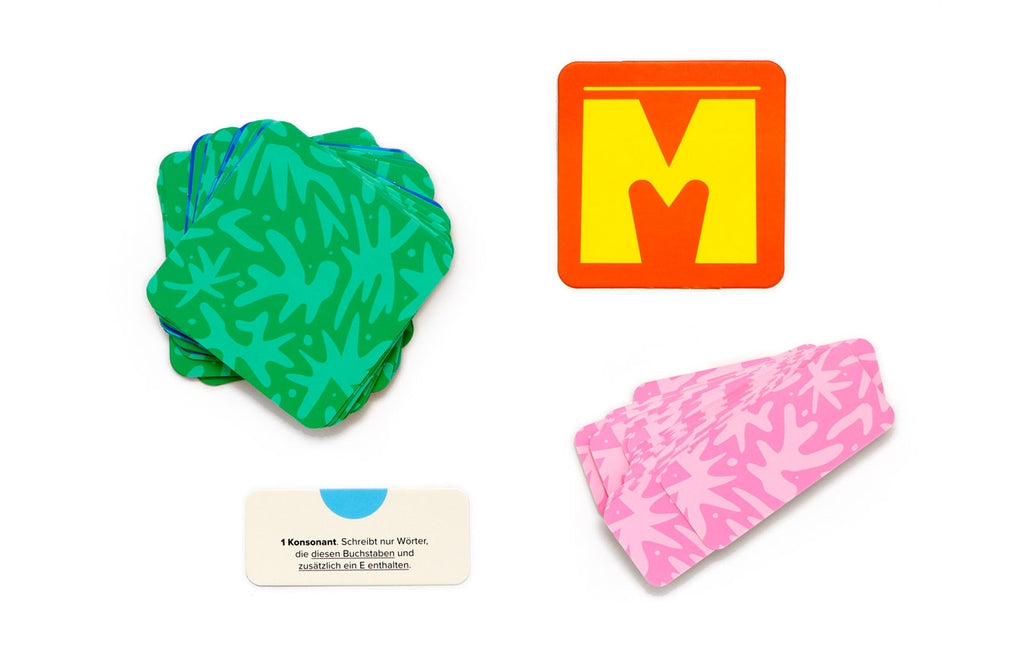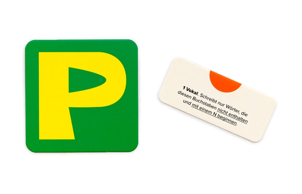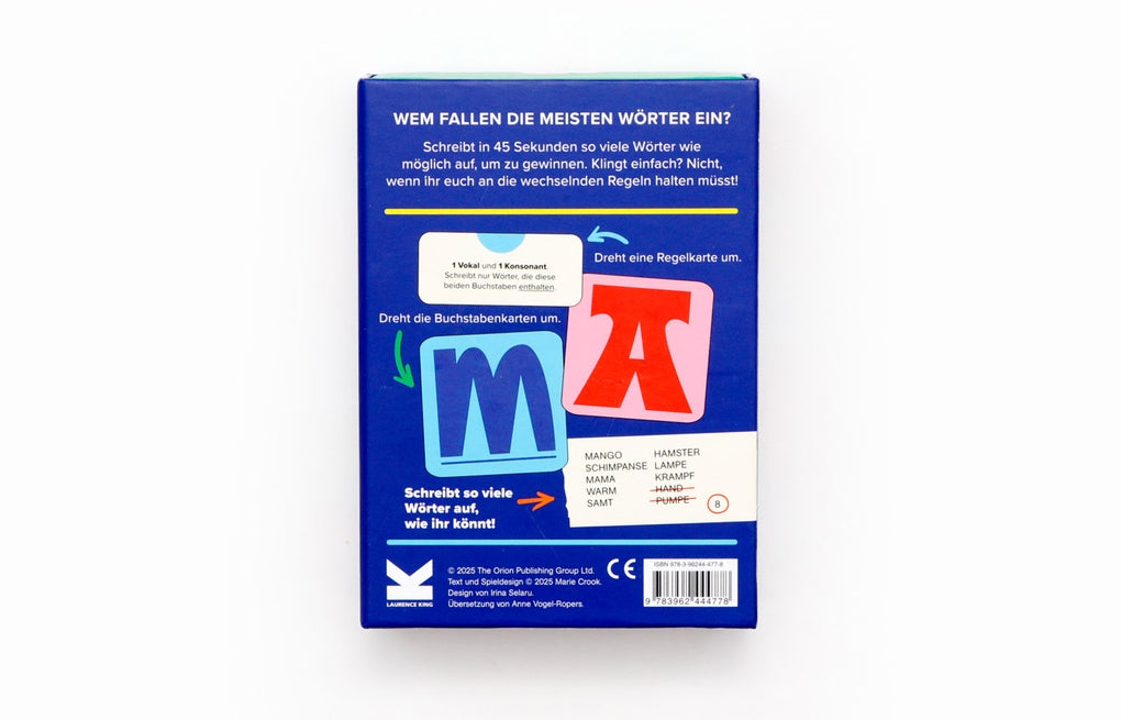 Wem fallen die meisten Wörter ein? Alle schreiben in 45 Sekunden so viele Wörter auf, wie ihnen einfallen. Klingt einfach? Nicht, wenn man sich an die wechselnden Regeln halten muss! In jeder Runde werden eine Regelkarte und die entsprechenden Buchstabenkarten aufgedeckt, und dann schreiben alle unterBerücksichtigung der Regel so schnell wie möglich so viele Wörter wie möglich auf. Auf die Stifte, fertig, los!