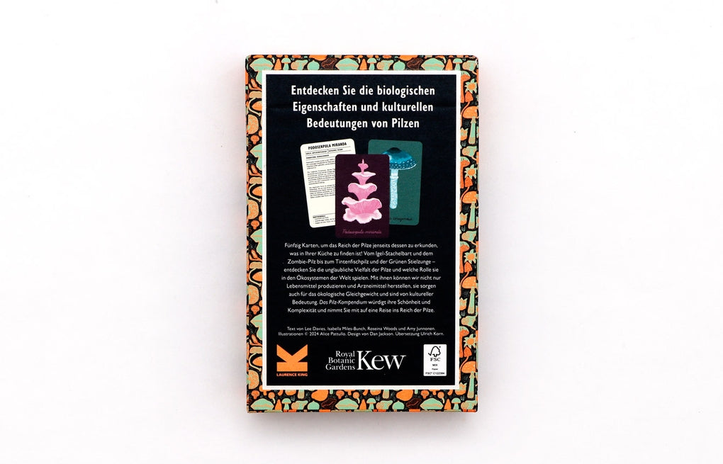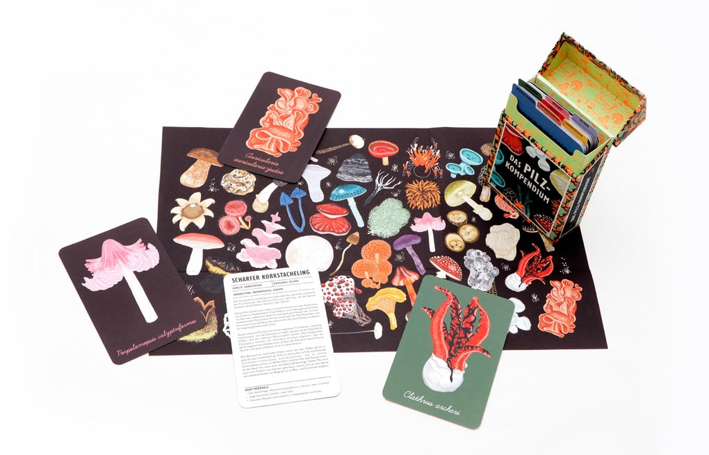 Erfahrt in dieser wunderschönen Box alles, was ihr schon immer wissen wolltet über die biologischen Eigenschaften und die kulturelle Bedeutung von Pilzen! Mit den 50 liebevoll illustrierten Karten könnt ihr das Reich der Pilze jenseits dessen erkunden, was in eurer Küche zu finden ist. Vom Igel-Stachelbart und dem Zombie-Pilz bis zum Tintenfischpilz und der Grünen Stielzunge - entdeckt die unglaubliche Vielfalt der Pilze und lernt, welche Rolle sie in den O?kosystemen der Welt spielen. Denn mit Pilzen können wir nicht nur Lebensmittel produzieren und Arzneimittel herstellen, sie sorgen auch für das ökologische Gleichgewicht und sind von kultureller Bedeutung. „Das Pilz-Kompendium" würdigt ihre Schönheit und Komplexität und nimmt euch mit auf eine Reise ins Reich der Pilze!