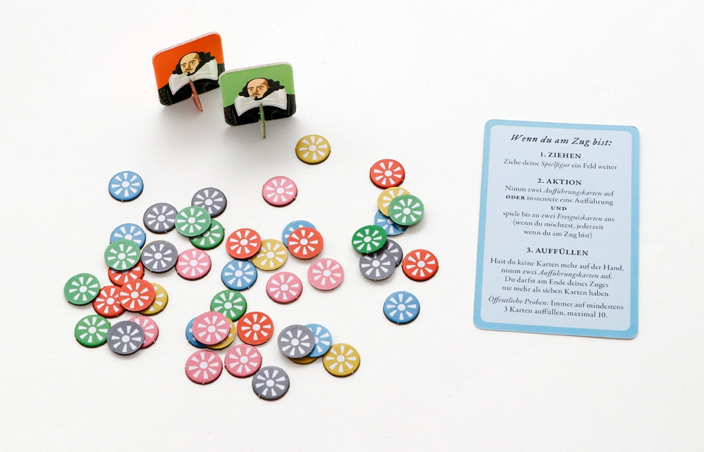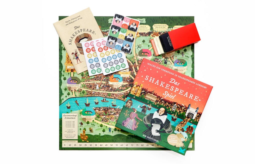 Reist auf den Spuren des beliebtesten Dramatikers der Welt von Stratford nach London, sammelt Aufführungskarten und versucht, an den Londoner Theatern möglichst viele Stücke zu inszenieren, bevor böswillige Mitspielend eure Ideen vereiteln, euch in den Tower stecken oder die Pest verbreiten! In diesem unterhaltsamen Brettspiel für die ganze Familie erfahrt ihr jede Menge über das Elisabethanische England und über Shakespeares Stücke. Es gewinnt, wer mit Aufführungen das meiste Geld verdient hat und am schnellsten zu Ruhm und Ehre gelangt ist.