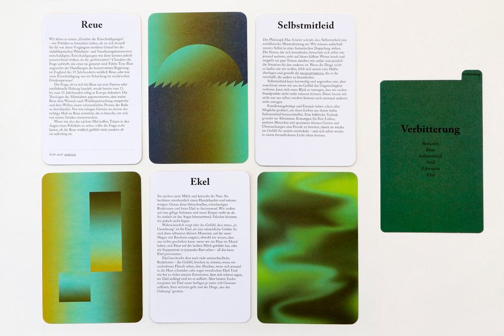 Gefühle sind der Wegweiser durch das Leben - und so findet ihr auf jeder Karte einen Text über eine bestimmte Emotion auf der einen Seite und einen faszinierenden Farbverlauf, welcher das Gefühl visualisiert, auf der anderen. Ihr erfahrt mehr über euch selbst und darüber, wie eure Mitmenschen empfinden. Die Bandbreite reicht von Wut und Sorge bis zu Empathie und Mut. Hinzu kommt eine Vielzahl von Emotionen, die ihr zwar als Gefühlszustand kennt, für die unsere Kultur jedoch keinen eigenen Begriff entwickelt hat - wie Awumbuk, Fado oder Lítost - euch wird sich eine ganz neue Seite eures Seelenlebens eröffnen!