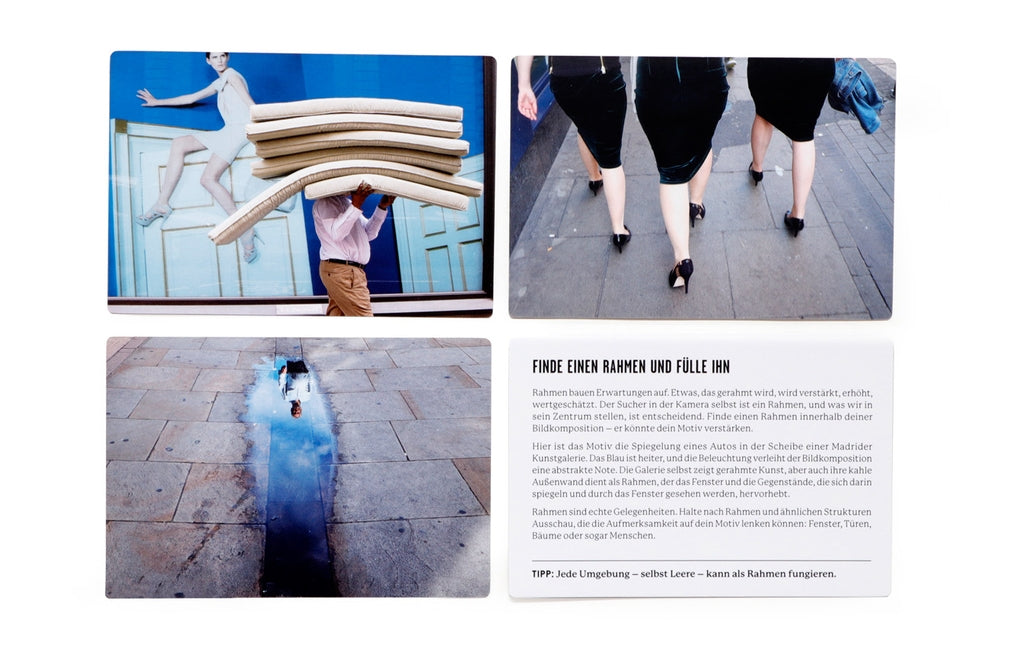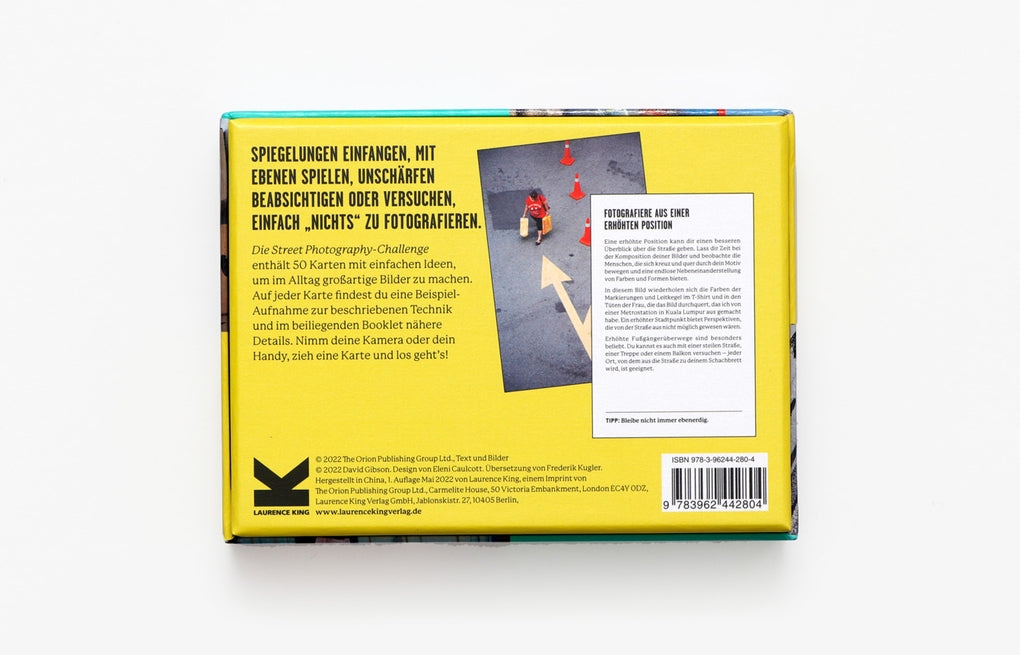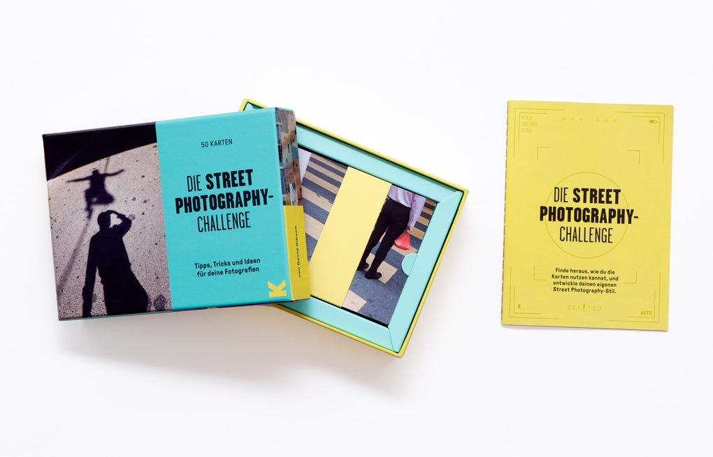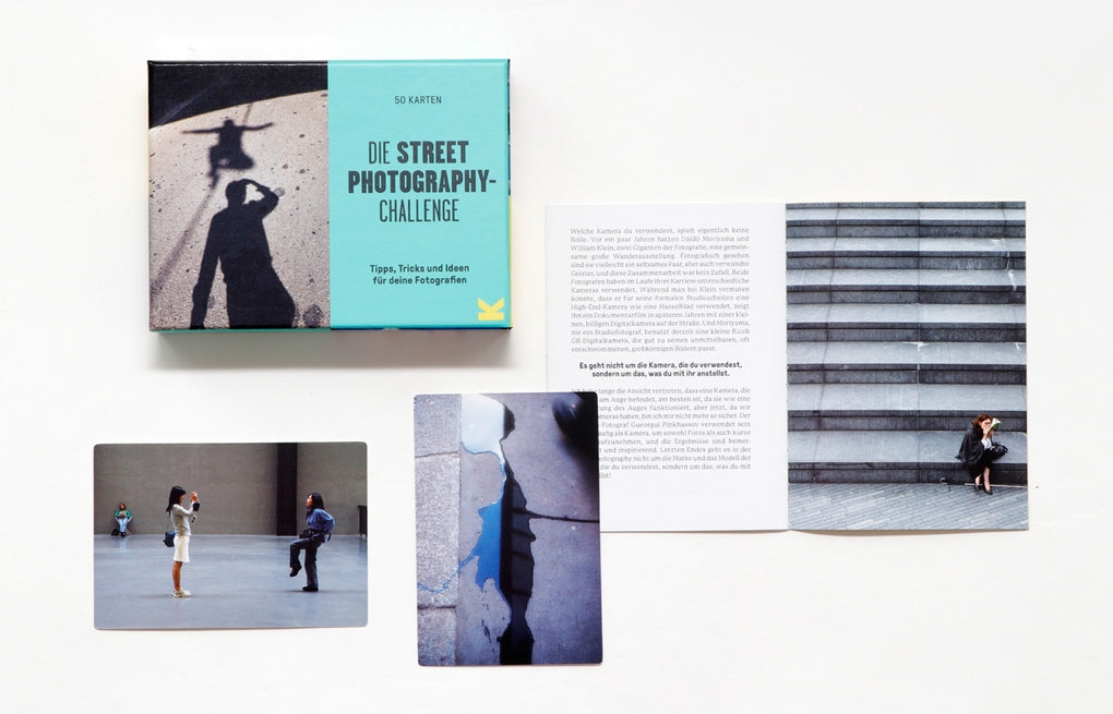Spiegelungen einfangen, mit Ebenen spielen, Unschärfen beabsichtigen oder versuchen, einfach 'nichts' zu fotografieren. Die Street Photography-Challenge enthält 50 Karten mit einfachen Ideen, um im Alltag großartige Bilder zu machen. Auf jeder Karte findet ihr eine Beispiel-Aufnahme zur beschriebenen Technik und im beiliegenden Booklet nähere Details. Außerdem sind 10 Karten mit Zitaten von Legenden der Street Photography enthalten, darunter Joel Meyerowitz, Diane Arbus und Garry Winogrand. Nehmt eure Kamera oder euer Handy, zieht eine Karte und raus auf die Straße!
