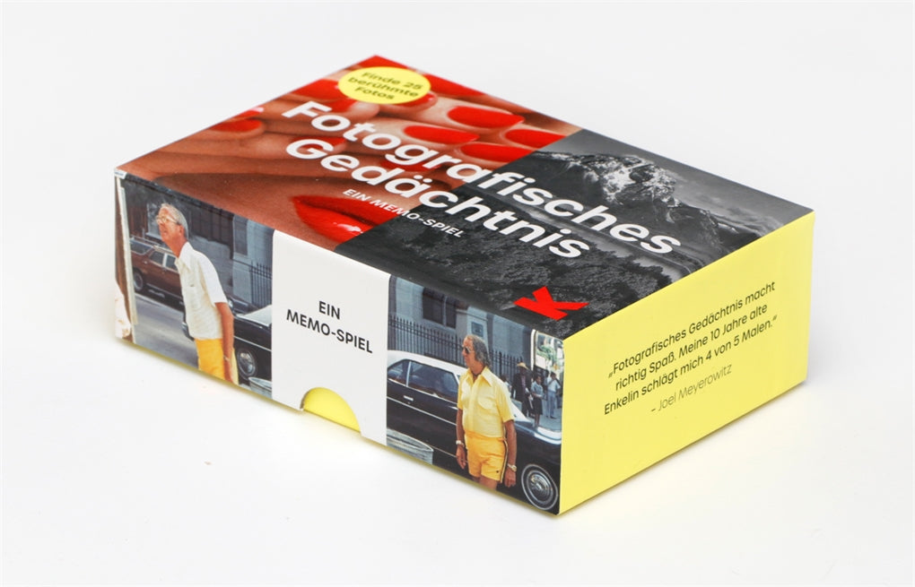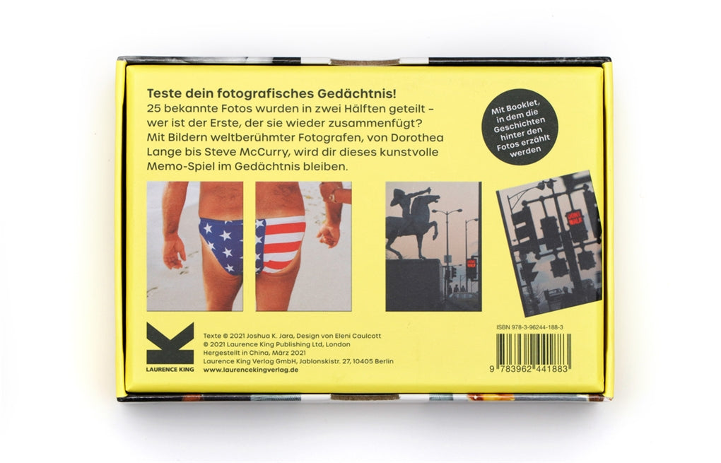 Habt ihr euch jemals ein fotografisches Gedächtnis gewünscht? Dann spielt dieses Memo und prägt euch 25 Foto-Klassiker ein, indem ihr die beiden Bildhälften als Memo-Pärchen zusammenfügt. Ganz nebenbei erfahrt ihr im beiliegenden Booklet auch etwas über die Geschichte der Fotografie. Mit 25 weltberühmten Fotografien internationaler Künstler*innen, von Anna Atkins bis Martin Parr, ist dieses einzigartige Memo-Spiel ein perfektes Geschenk - nicht nur für Fans von Fotografie und Kunst.