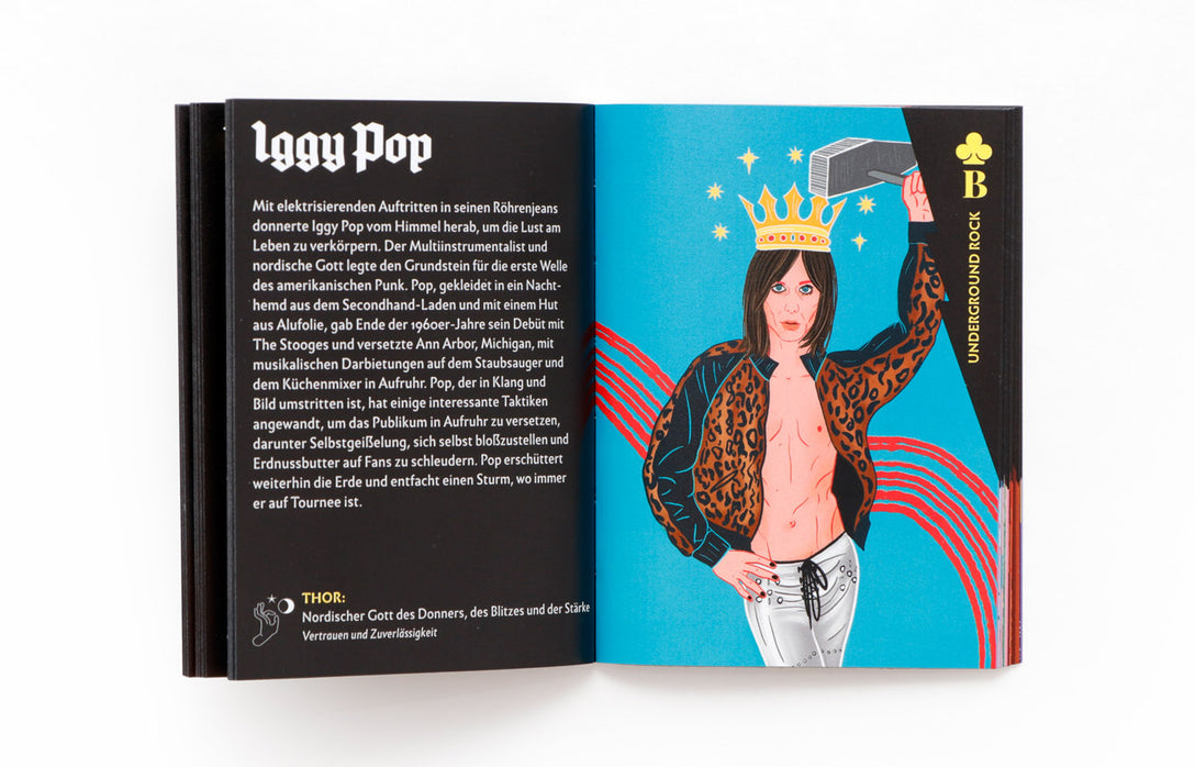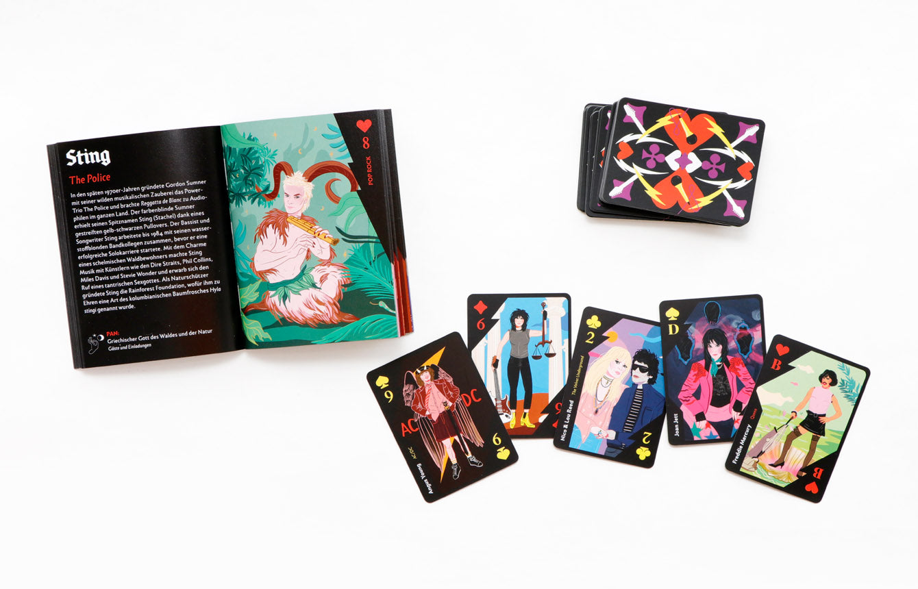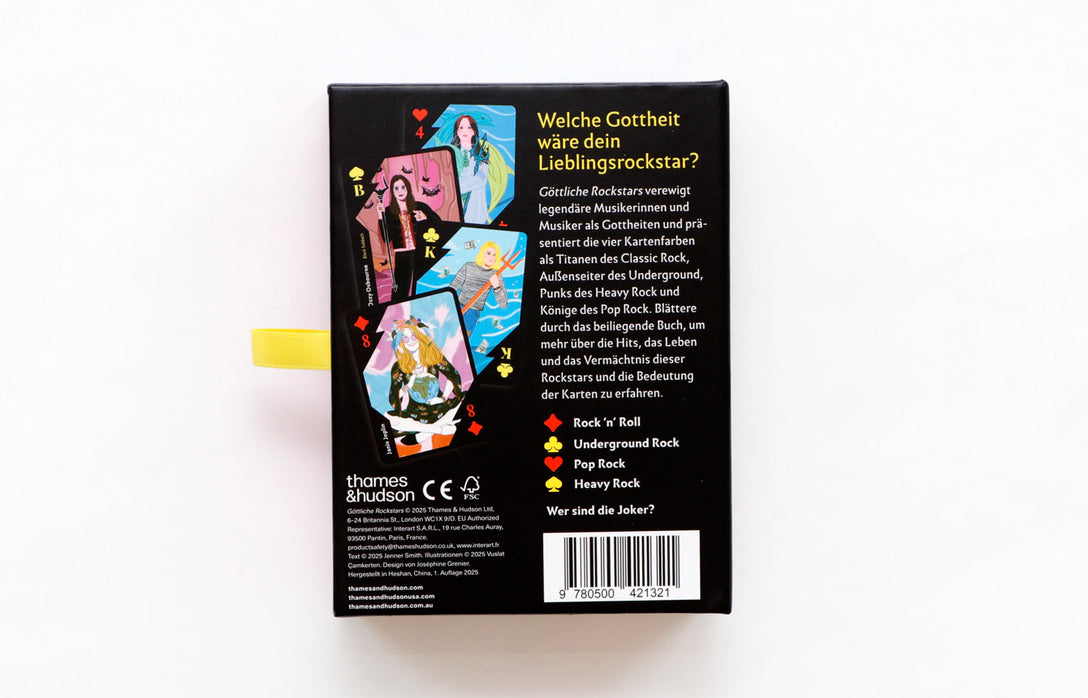Eigentlich wussten wir es schon immer – Freddie Mercury ist Venus, Janis Joplin Gaia und Kurt Cobain Poseidon. Im Booklet erfahrt ihr mehr über diese göttlichen Verbindungen. Nutzt dieses Kartendeck für klassische Kartenspiele, aber auch, um eure Zukunft vorherzusagen oder Wahrheiten über eure Gegenwart zu erfahren. Welcher Rockstar steht für Vorsicht in Beziehungen? Wer sagt Veränderungen voraus? Und wer erfüllt dir einen Wunsch?