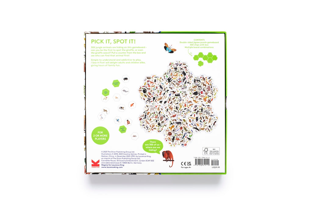 Now in a square box, I Saw it First! Jungle includes a double-sided hexagonal board and 300 counters with charming animal illustrations by Caroline Selmes. Simple to understand and addictive to play, this fun and challenging game will delight adults and children alike.