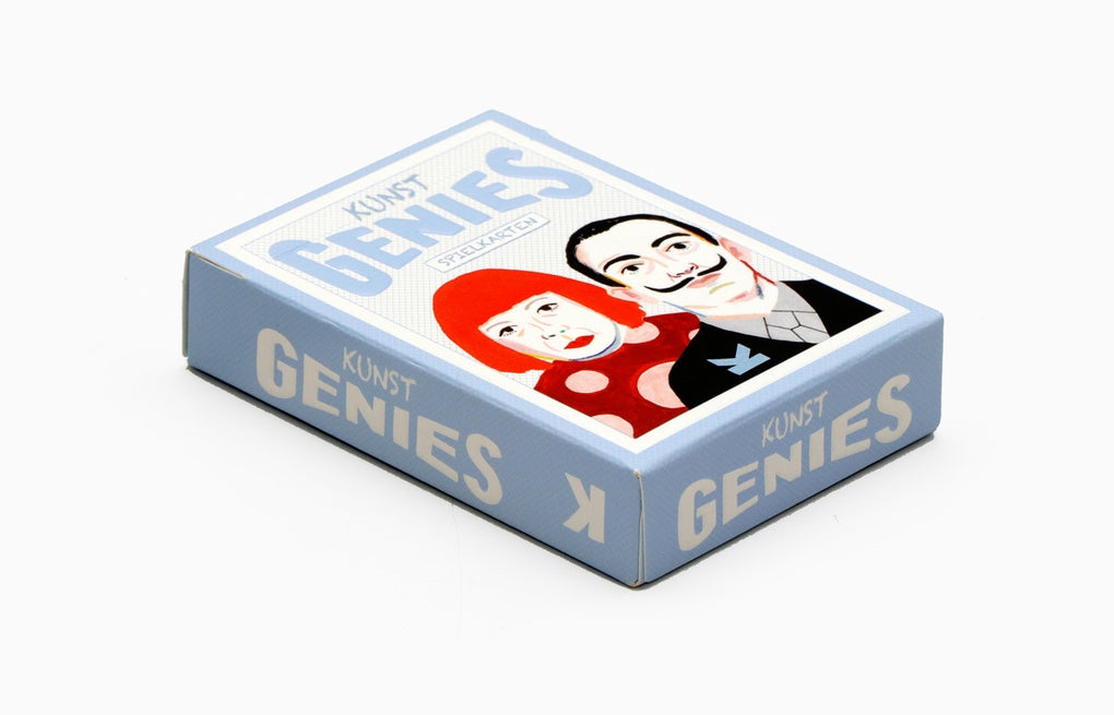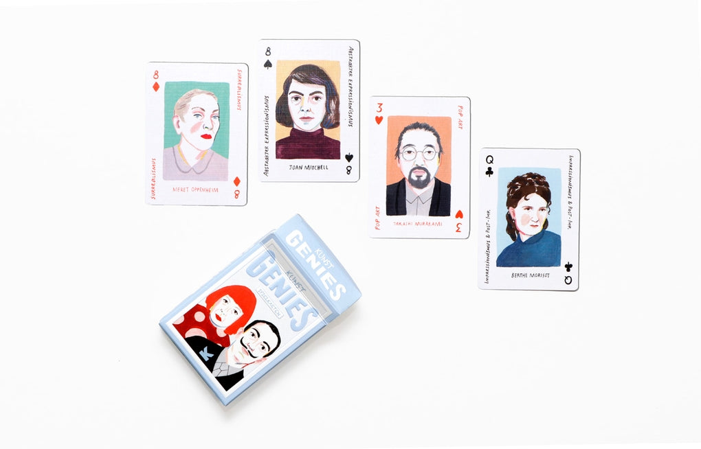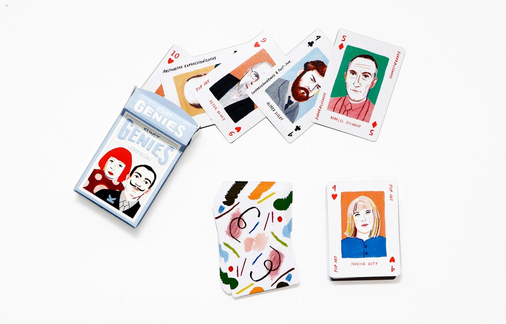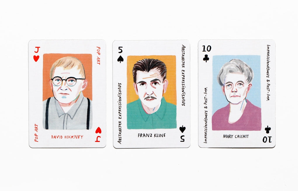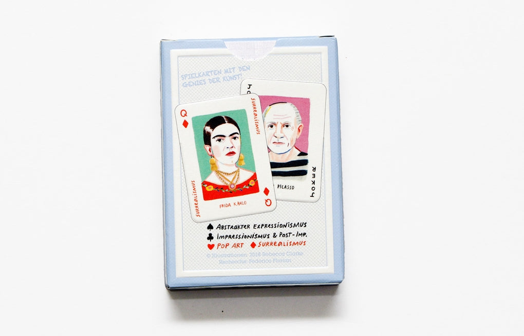 Die 52 Spielkarten zeigen Portraits der großen Stars der Kunstwelt - darunter Lichtenstein und Hockney, Monet und Renoir, Pollock und Rothko, und Dalí und Kahlo. Und ein paar ganz besondere Joker-Künstler*innen sind auch dabei!
