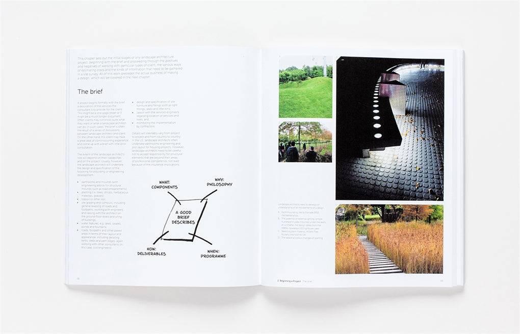 After discussing the history of the profession, the book explains the design process through principles such as hierarchy, human scale, unity, harmony, asymmetry, colour, form and texture. It looks at how design is represented through both drawing and modelling, and through digital techniques such as CAD and the use of GIS (Geographic Information Systems). This is followed by an examination of project management and landscape management techniques. Finally, the book explores educational and employment opportunities and the future of the profession in the context of climate change and sustainability.