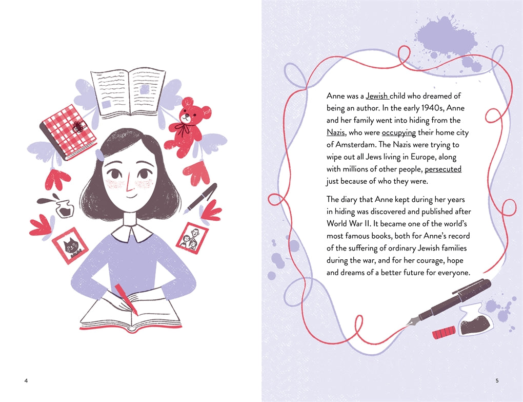Anne Frank was an ordinary girl living in extraordinary times. Forced to go into hiding to escape the Nazis’ persecution of Jews in World War II, Anne kept a diary that would become one of the most famous books in the world.
