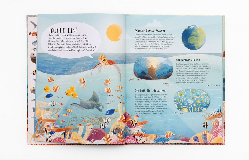 Nach dem Erfolg von Mit Feli durch die Nacht (2018) stellt dieses liebevoll illustrierte Buch euch die Ozeane vor und behandelt Themen wie Meeresströmungen und Gezeiten, Tierwanderungen, die Mysterien unbekannter Tiefen und die Gefährdung der Ozeane sowie unsere Möglichkeiten sie zu schützen.