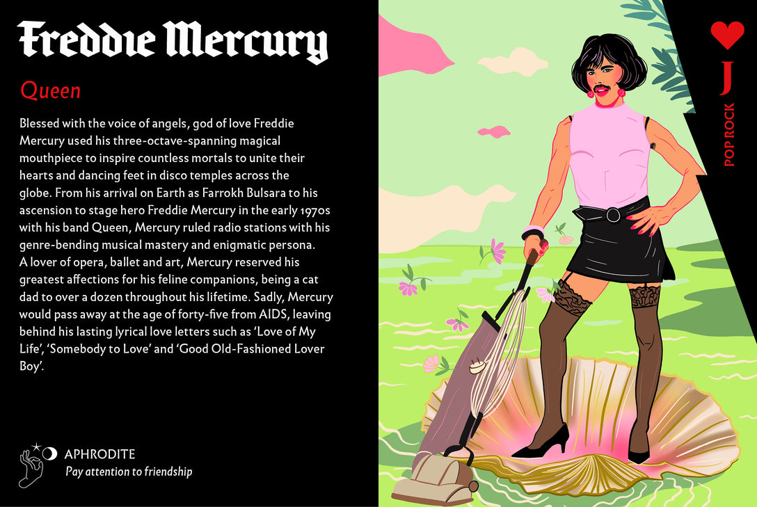 Eigentlich wussten wir es schon immer – Freddie Mercury ist Venus, Janis Joplin Gaia und Kurt Cobain Poseidon. Im Booklet erfahrt ihr mehr über diese göttlichen Verbindungen. Nutzt dieses Kartendeck für klassische Kartenspiele, aber auch, um eure Zukunft vorherzusagen oder Wahrheiten über eure Gegenwart zu erfahren. Welcher Rockstar steht für Vorsicht in Beziehungen? Wer sagt Veränderungen voraus? Und wer erfüllt dir einen Wunsch?