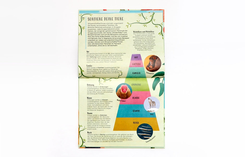 Dieses eindrucksvoll illustrierte Buch entstand in Zusammenarbeit mit dem Natural History Museum in London und zeigt die erstaunliche Vielfalt der Tierwelt auf der ganzen Welt sowie die verschiedenen Merkmale, die ihren Platz im Tierreich bestimmen. Von Walen bis zu Würmern und von Schlangen bis zu Stinkkäfern - jedes Lebewesen, das jemals entdeckt wurde, wurde einer Gruppe innerhalb des Tierreichs zugeordnet. Erfahrt mehr über die Ähnlichkeiten, Unterschiede und Verbindungen zwischen den Tiergruppen und lernt, warum diese Klassifizierung von Tieren wichtig ist: Sie hilft zum Beispiel der Wissenschaft, Arten zu entdecken und zu erforschen, aber auch Tiere und ihre Lebensräume zu schützen und zu erhalten.