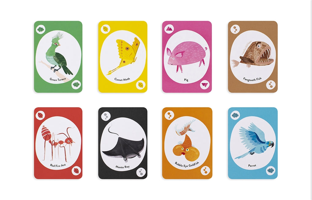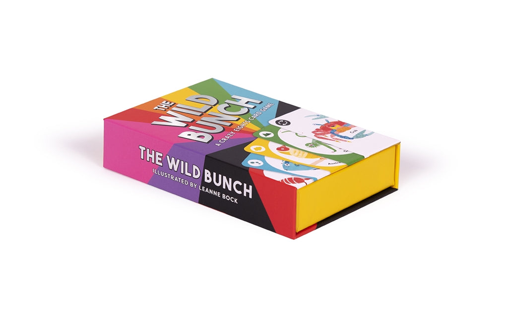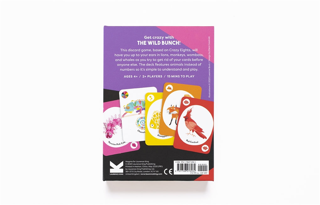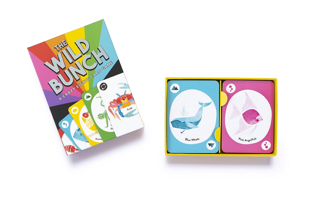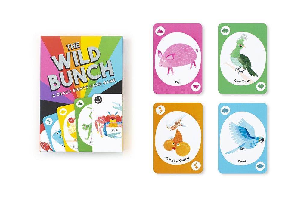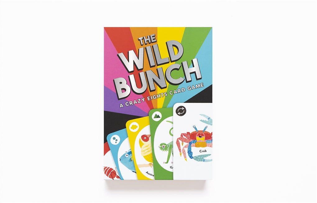 Get crazy with The Wild Bunch! This discard game, based on Crazy Eights, will have you up to your ears in lions, monkeys, wombats and whales as you try to get rid of your cards before anyone else. The deck features animals instead of numbers so kids of any age can understand and play, and there are loads of exciting action cards to change things up: play the crab to reverse direction, or the kangaroo to skip over the next player!