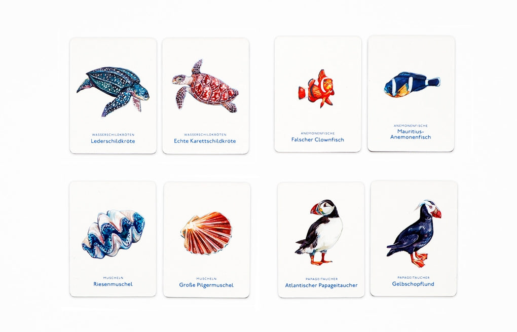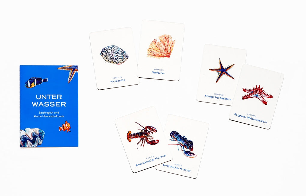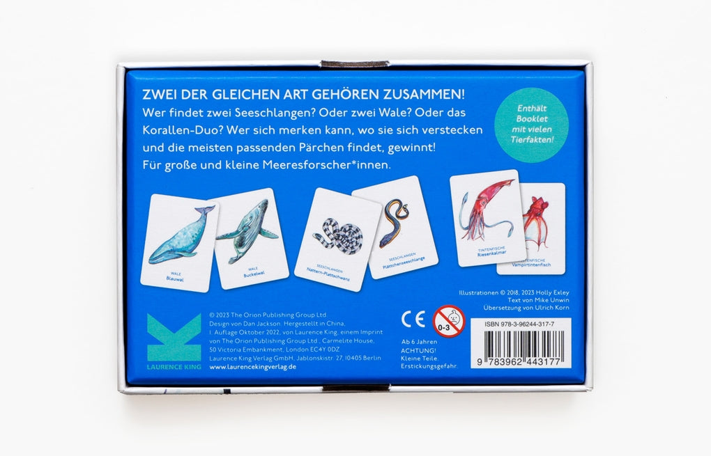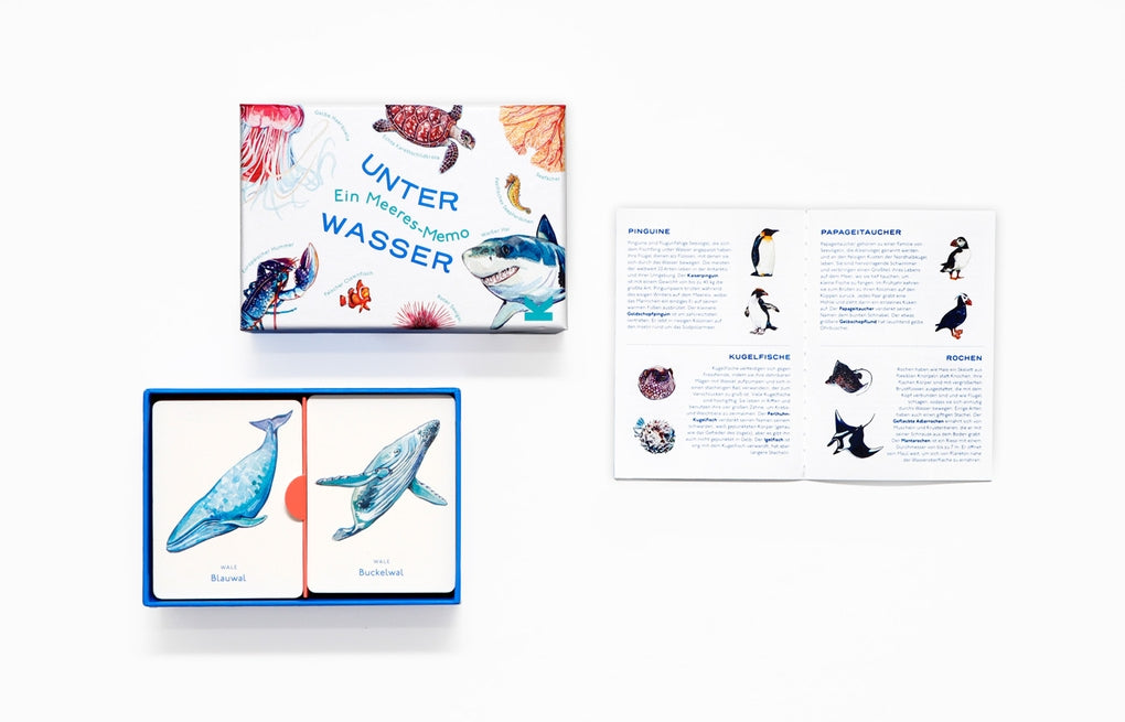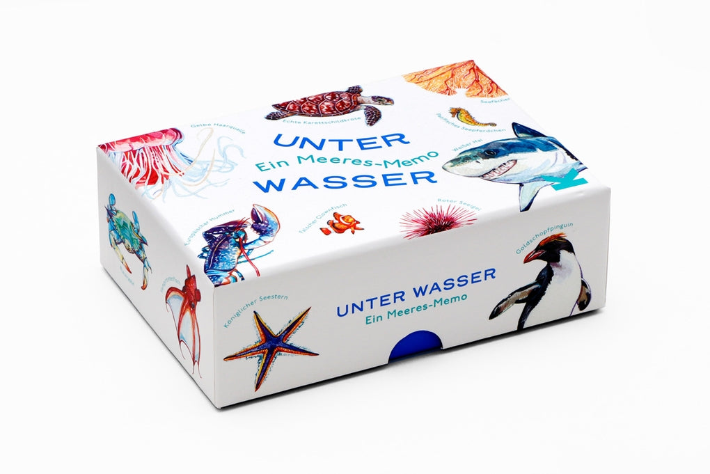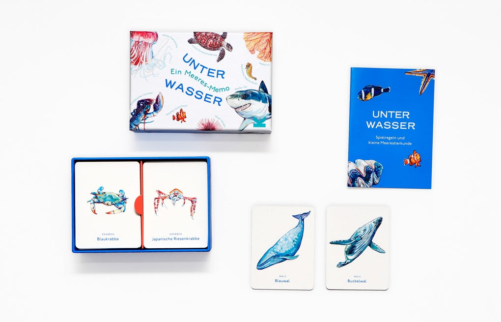 Unter Wasser ist ein Memo für große wie kleine Meeresforscher*innen: Immer zwei Meeresbweohner der gleichen Art gehören zusammen. Wer findet die zwei Seeschlangen? Oder die beiden Wale? Oder das Korallen-Duo? Wer sich merken kann, wo sie sich verstecken und die meisten passenden Pärchen findet, gewinnt! Die herrlichen Tierzeichnungen sprechen für sich!
