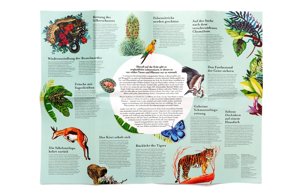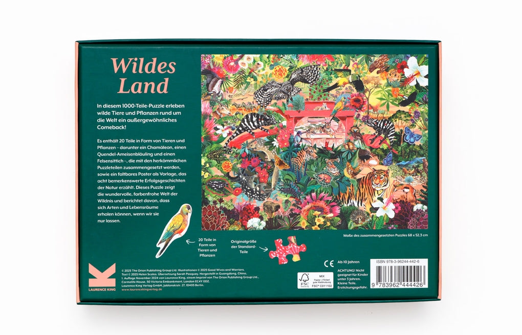 In diesem 1000-Teile-Puzzle erleben die Landlebewesen der Erde ein außergewöhnliches Comeback! Es enthält 20 Teile in Form von Tieren und Pflanzen, die mit den herkömmlichen Puzzleteilen zusammengesetzt werden können, sowie ein faltbares Poster, das elf bemerkenswerte Erfolgsgeschichten der Natur erzählt. Dieses Puzzle zeigt die wundervolle, farbenfrohe Welt unserer Flora und Fauna und berichtet davon, wie sich Arten und Lebensräume erholen können, wenn wir sie lassen.